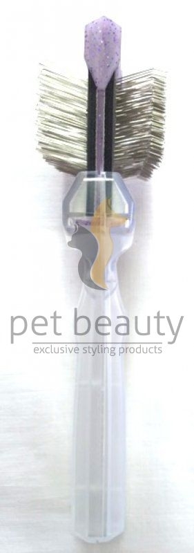 Diese Bürste hat 2 unterschiedliche Seiten - eine Seite mit abgeknickten Pins zum Kämmen und Entfilzen, die andere Seite mit geraden Pins zum Entfernen der losen Haare.