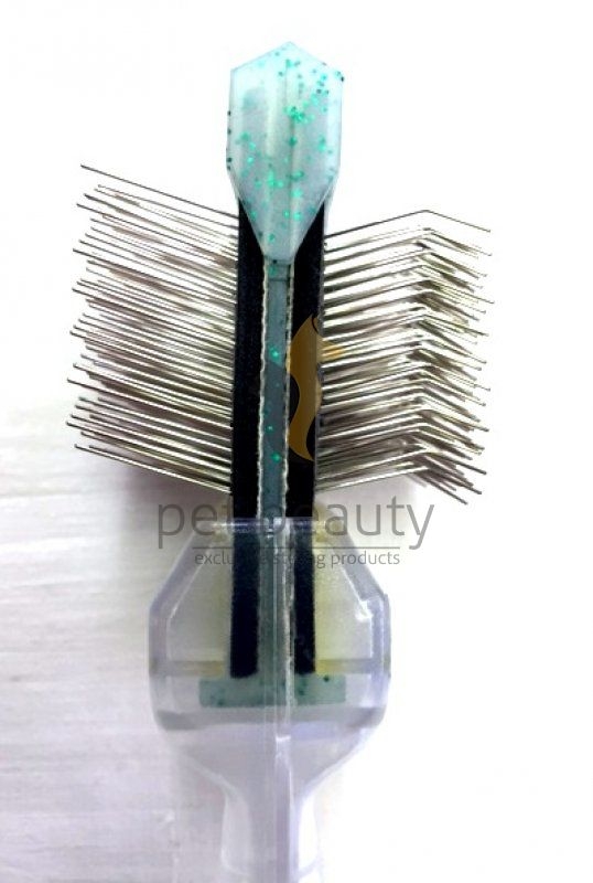 Diese Bürste hat 2 unterschiedliche Seiten - eine Seite mit abgeknickten Pins zum Kämmen und Entfilzen, die andere Seite mit geraden Pins zum Entfernen der losen Haare.