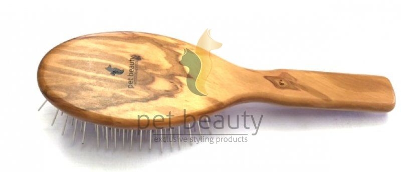 Die Olivenholzbürste wird aus feinstem Olivenholz gefertigt. Die hochwertigen Metallpins sind in ein weiches Gummikissen gebettet.