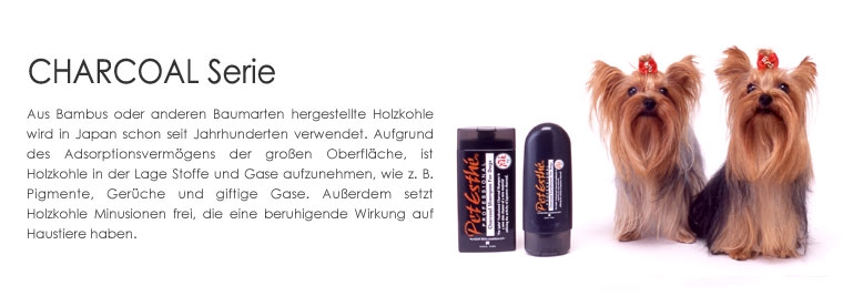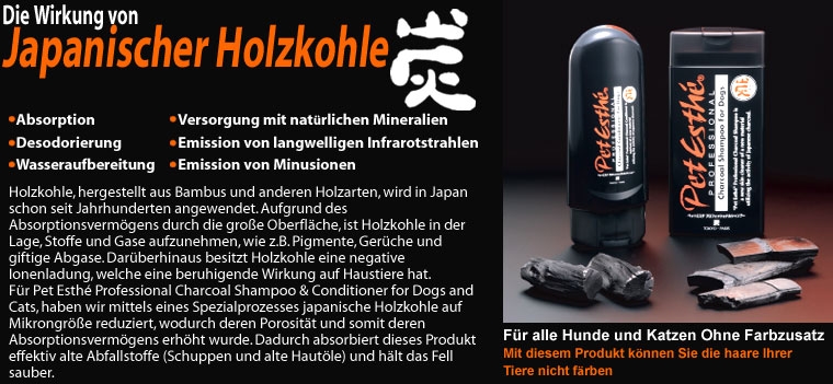 Japanische Holzkohle und Bambusholzkohle wird schon seit Langem verwendet um Abfallstoffe zu adsorbieren, natürliche Mineralien zu erhalten, Minusionen freizusetzen und um unangenehme Gerüche zu beseitigen. Aufgrund dieser Eigenschaften des Shampoos adsorbiert es Schmutz sowie Gerüche und reinigt und baut das Fell und die Haut auf.