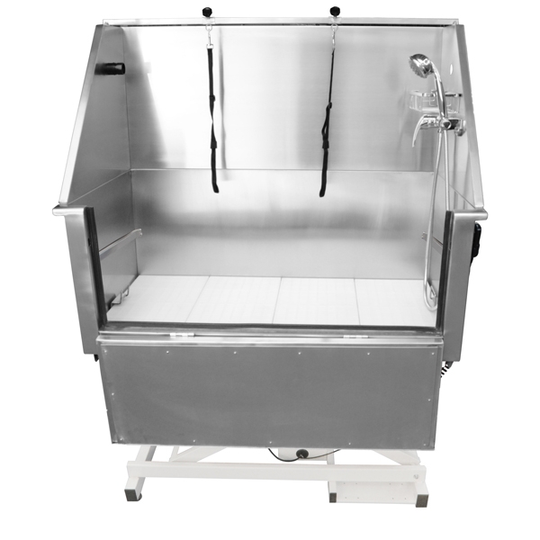 Professionelle Hundebadewanne aus Edelstahl, langlebig und robust, rostfrei, kratzfest und leicht zu reinigen. Die elektrische Liftfunktion und der große, klappbare Fronteinstieg ermöglichen ermüdungsfreies Arbeiten ebenso wie das leichtere Einsteigen größerer Hunde. Die Wanne selbst steht rutschfest und sicher und ist für die Hunde mit einer rutschfesten Innenausstattung ausgerüstet. Sie überzeugt mit durchdachten Funktionen wie praktischen Ablagen für Shampoo und Utensilien, einer Befestigungsmöglichkeit für die Hunde und einem verkleinernden Einsatz zum Baden kleiner Hunde. Der Duschschlauch und die Armatur sind inklusive. An der linken Seite befindet sich neben der Bedienung für die Höhenverstellung auch ein Anschluss für einen Fön.