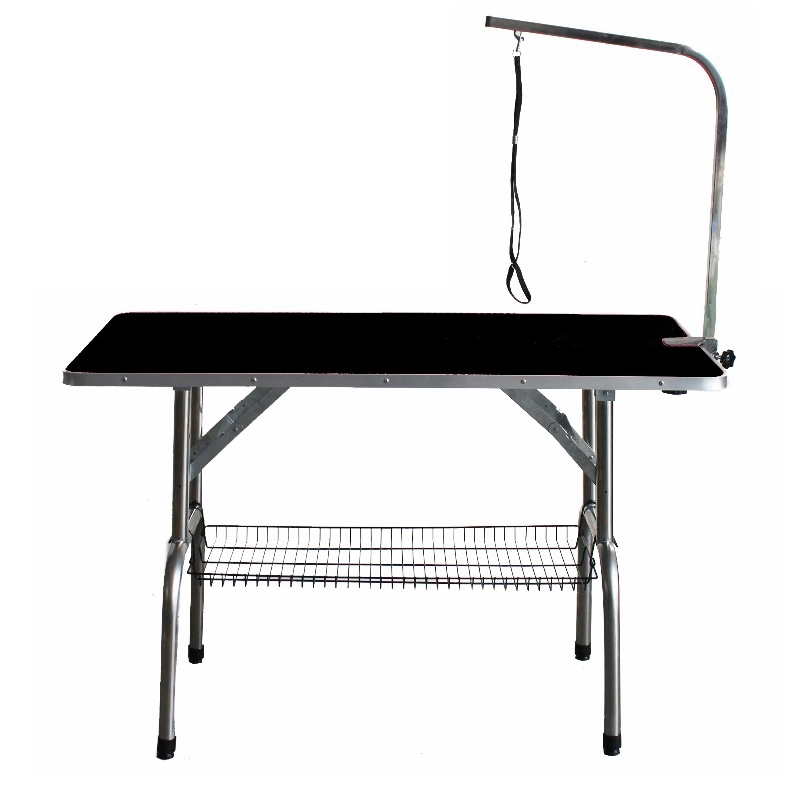 Praktischer Trimmtisch für den Salon, die Show und daheim. Die höhenverstellbaren Füße mit Gummiabdeckung sorgen für einen sicheren Stand, der Faltmechanismus für eine platzsparende Aufbewahrung. Die Tischplatte mit einer Einfassung aus Aluminium ist selbstverständlich rutschfest und pflegeleicht. Der Tisch ist inklusive einem Haltearm aus Edelstahl (höhenverstellbar) mit Nylonschlaufe sowie einem praktischen Aufbewahrungskorb aus Metall.